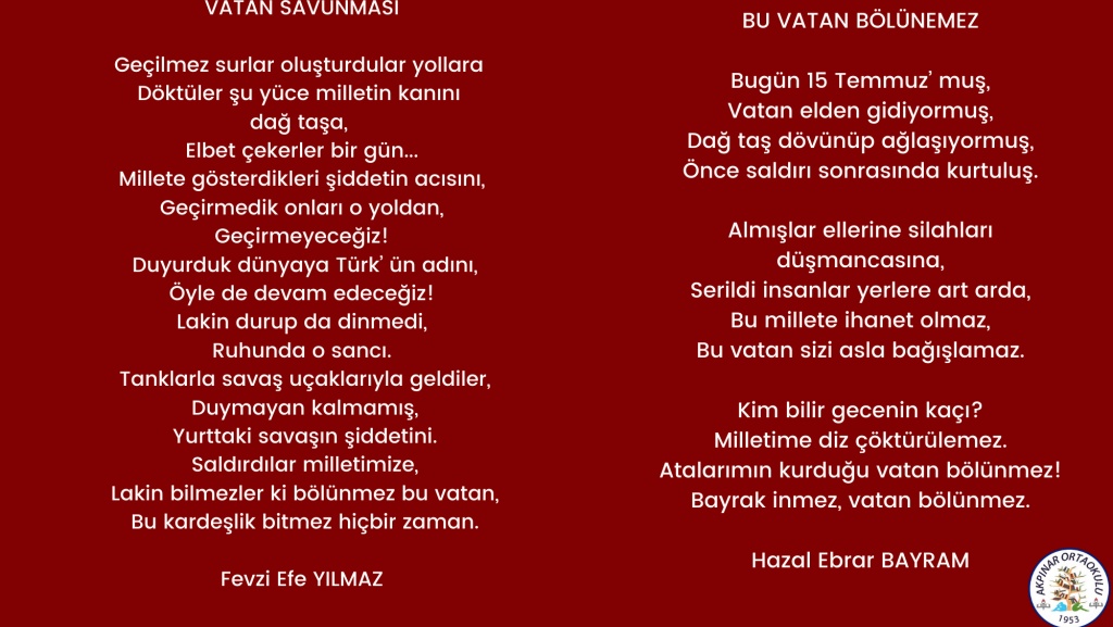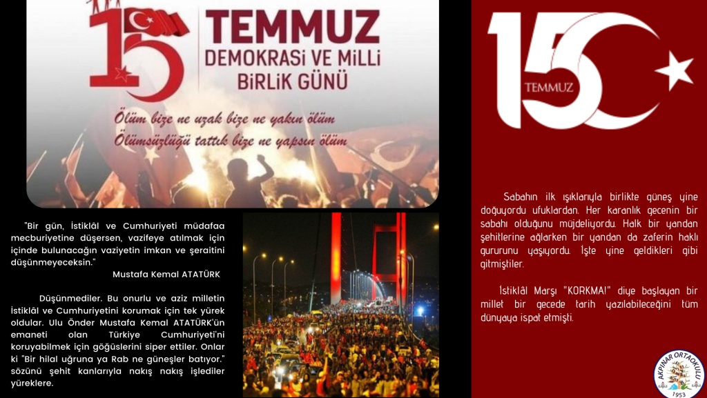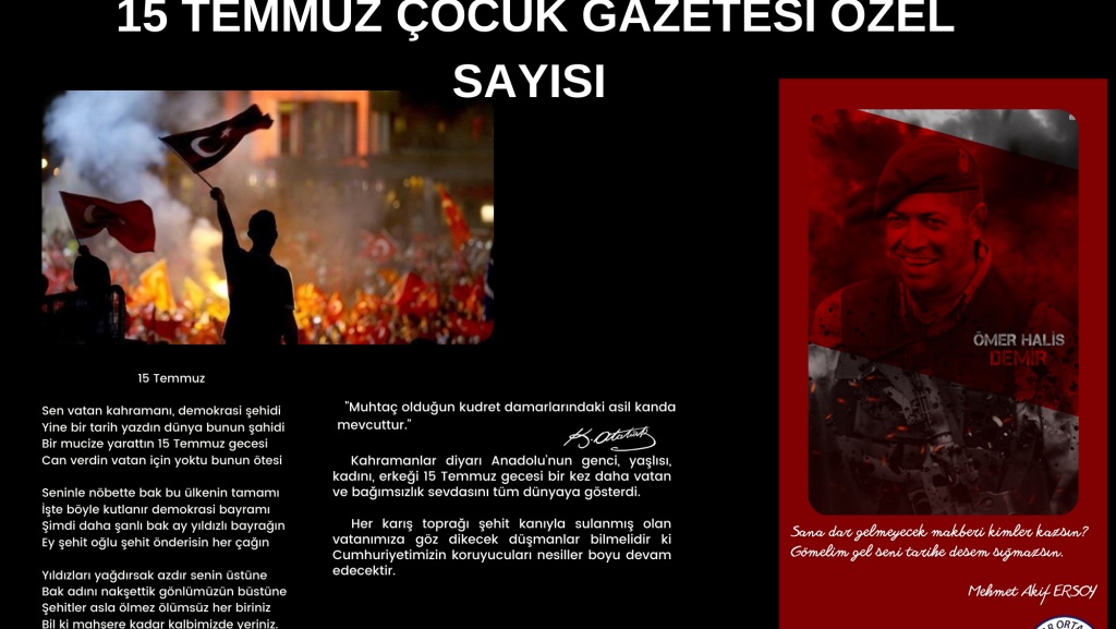 OKULUMUZ TÜRKÇE ÖĞRETMENİ SEDA ÜRKMEZ TARAFINDAN 15 TEMMUZ DEMOKRASİ VE MİLLİ BİRLİK GÜNÜ GAZETESİ HAZIRLANMIŞ OLUP KENDİSİNE TEŞEKKÜR EDERİZ. ŞEHİTLERİMİZE ALLAH' TAN RAHMET DİLERİZ.MİLLETİMİZİN BAŞI SAĞ OLSUN.